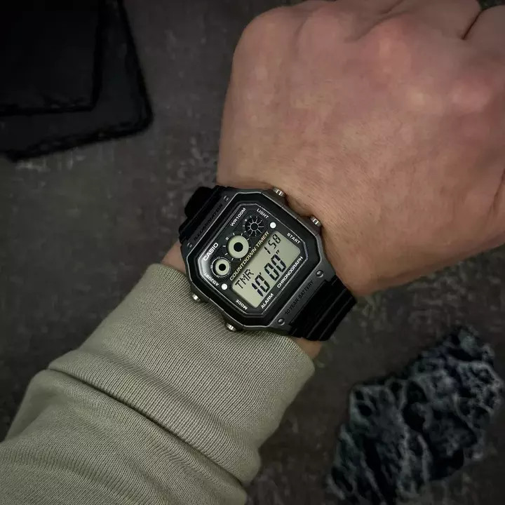 Представляємо годинник Casio AE-1300WH-8A — стильний і функціональний аксесуар для чоловіків, який підходить для активного способу життя. Цей спортивний годинник має квадратно форму корпусу з легкого полімеру та виконаний у елегантному зеленому кольорі, що ефектно контрастує з чорним ремінцем.