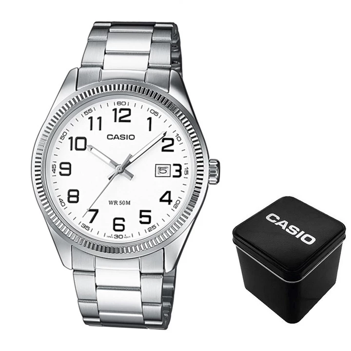Представляємо вам чоловічий годинник Casio MTP-1302D-7B, який об'єднує в собі елегантний дизайн та функціональність. Цей аксесуар з класичним круглим корпусом з нержавіючої сталі має сріблястий колір, що додає йому витонченості.